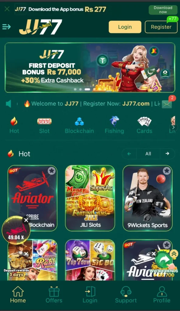JJ77 Game app is an online casino style gaming application that offers a huge variety of casino games. This app is one of the best games that is loved by online gamers particularly in Pakistan. This app allows you to earn money in less to no time. Players can invest a small amount of money and earn much more than they invest. The app is linked with trusted payment applications like EasyPaisa and JazzCash. The game is known for its fair and transparent gaming. It is a smooth and easy application that can be used by anyone.