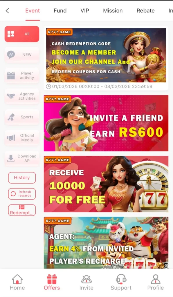 Referral Bonus: Incentives for inviting friends to join R777, rewarding both the referrer and the new player.